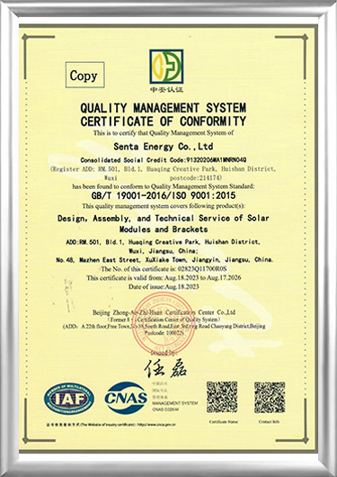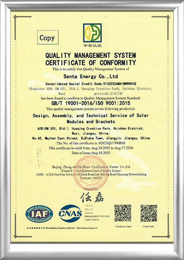 Ditubuhkan pada 2016, Senta Energy Co., Ltd., yang terletak di Wuxi, Jiangsu, ialah perusahaan berteknologi tinggi yang terutamanya terlibat dalam perniagaan penjanaan kuasa fotovoltaik tenaga baharu dan perniagaan penyimpanan tenaga, bangunan rumah pasang siap baharu dan perniagaan penanaman teragih pertanian baharu. Mengintegrasikan penyelidikan dan pembangunan bebas, pengeluaran, jualan dan perkhidmatan, kami komited untuk menyediakan pengguna global dengan penyelesaian keseluruhan untuk seluruh kitaran hayat tenaga pintar, bangunan pintar dan penanaman pintar.
